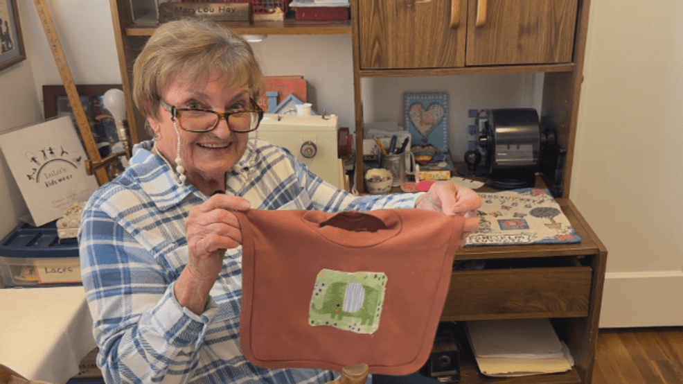 A 90-year-old woman volunteers at a senior center making children’s clothes